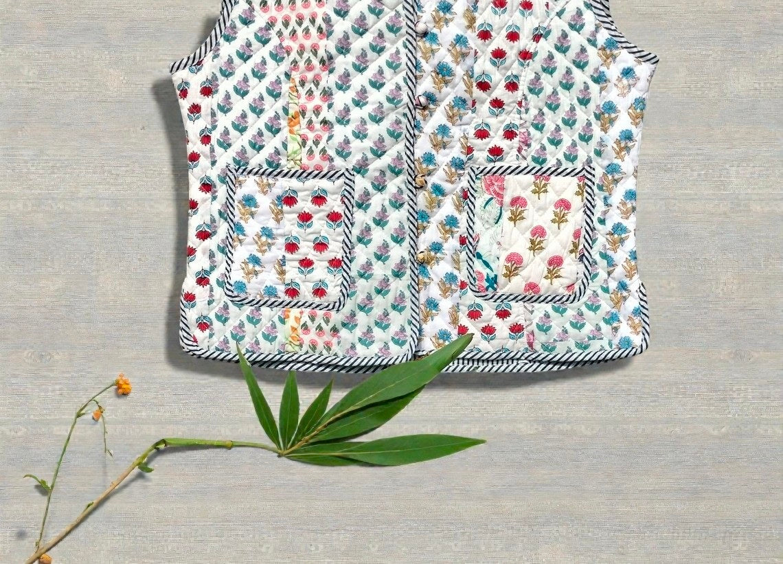 Each piece is handcrafted by skilled artisans of Rajasthan, using traditional wooden block printing techniques on 100% pure cotton fabric. The jacket is lightly quilted for warmth, soft on the skin, and designed for all-day comfort.