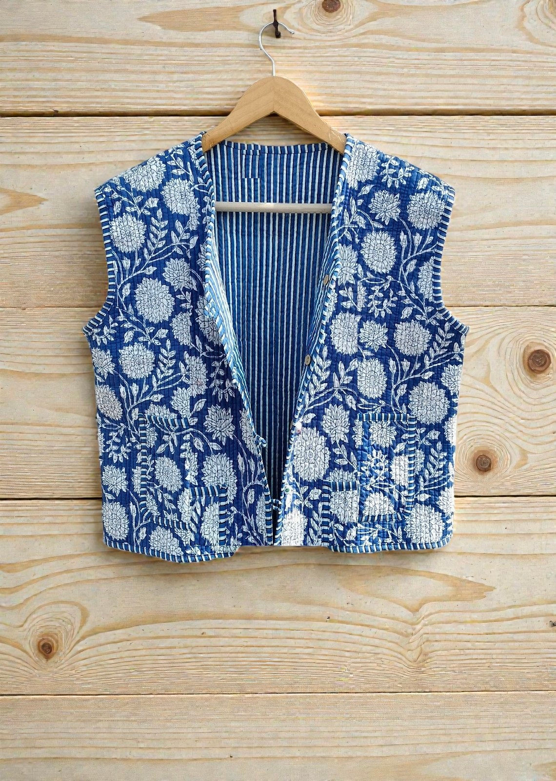 Each piece is handcrafted by skilled artisans of Rajasthan, using traditional wooden block printing techniques on 100% pure cotton fabric. The jacket is lightly quilted for warmth, soft on the skin, and designed for all-day comfort.